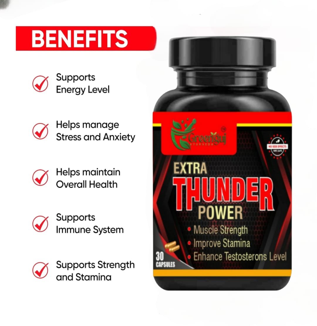 Extra Thunder Power by Greenguj Ayurveda is a 100% Ayurvedic stamina and energy booster capsule formulated to enhance strength, stamina, and vitality naturally. Made from pure herbal ingredients.