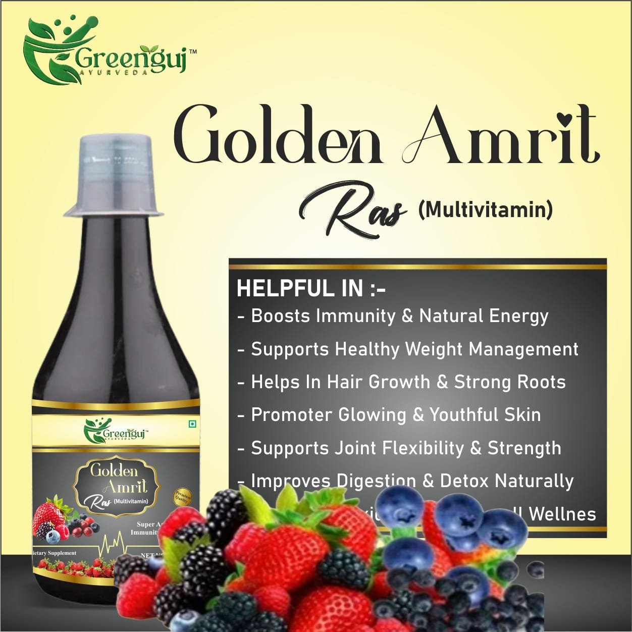 Experience the goodness of nature with Golden Amrit Ras from Greenguj Ayurveda — a unique herbal elixir crafted from 42 superberries and Ayurvedic herbs. Designed to nourish your body from within, this Ras helps improve immunity, energy, skin health, and vitality.